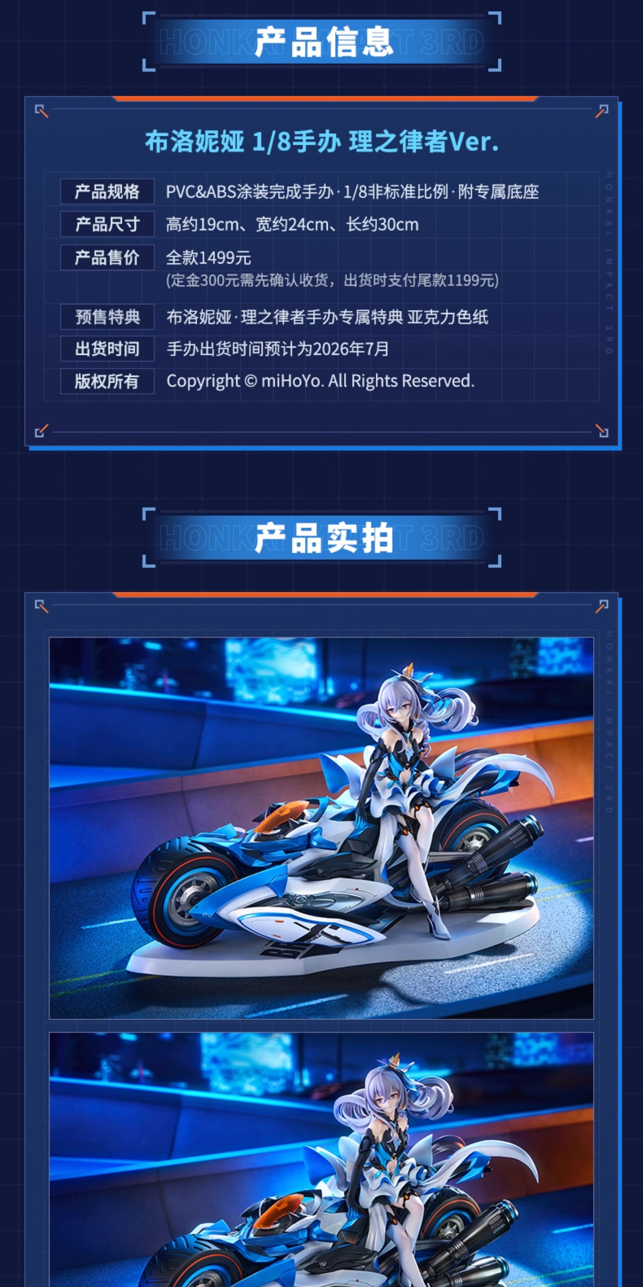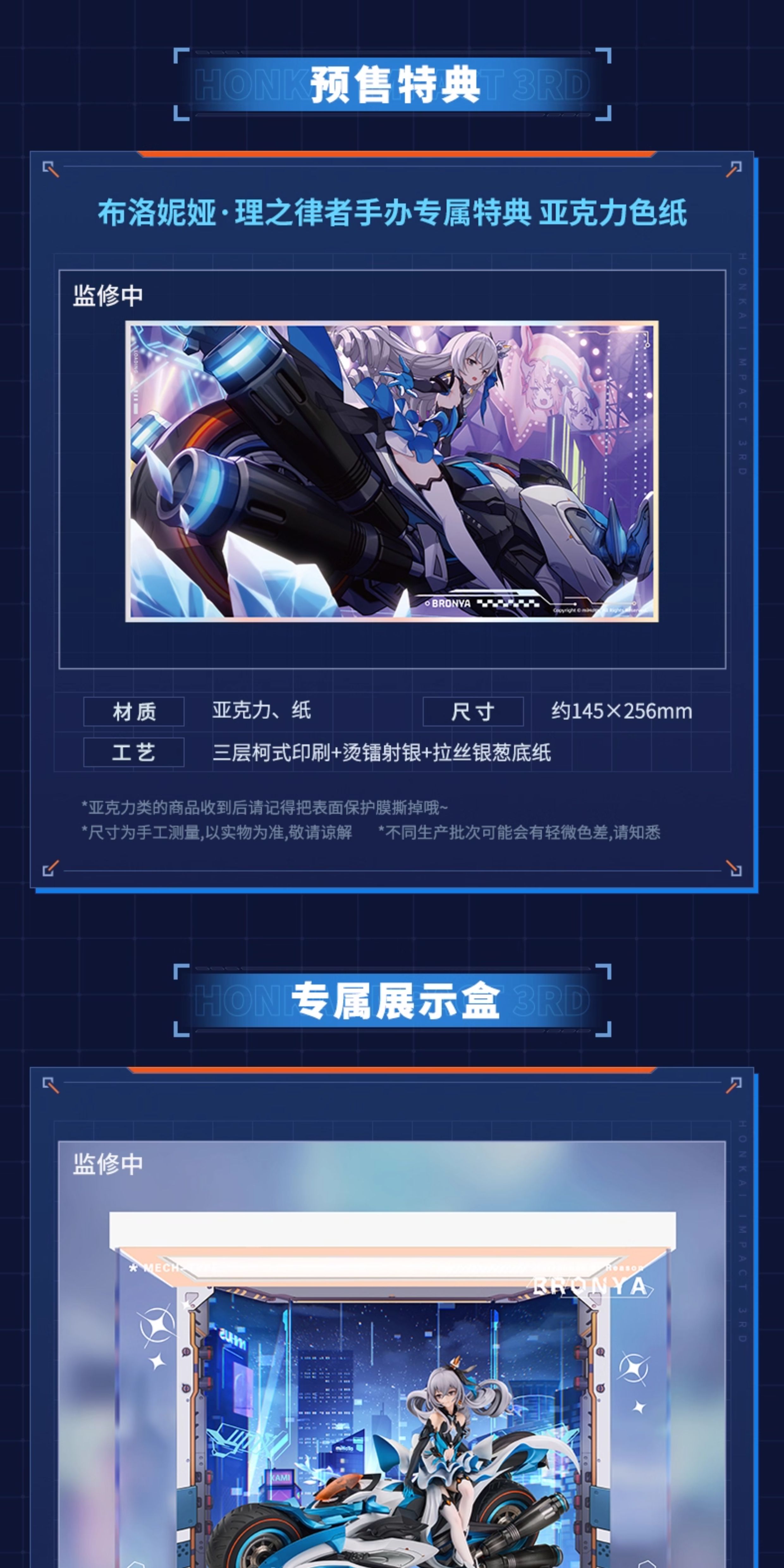 Expertly crafted from high-quality PVC and ABS, this figure stands approximately 19 cm tall and extends 30 cm in length with its detailed base. The figure features intricate paintwork that highlights the contrast between Bronya’s calm determination and the raw energy of her mechanical creation.