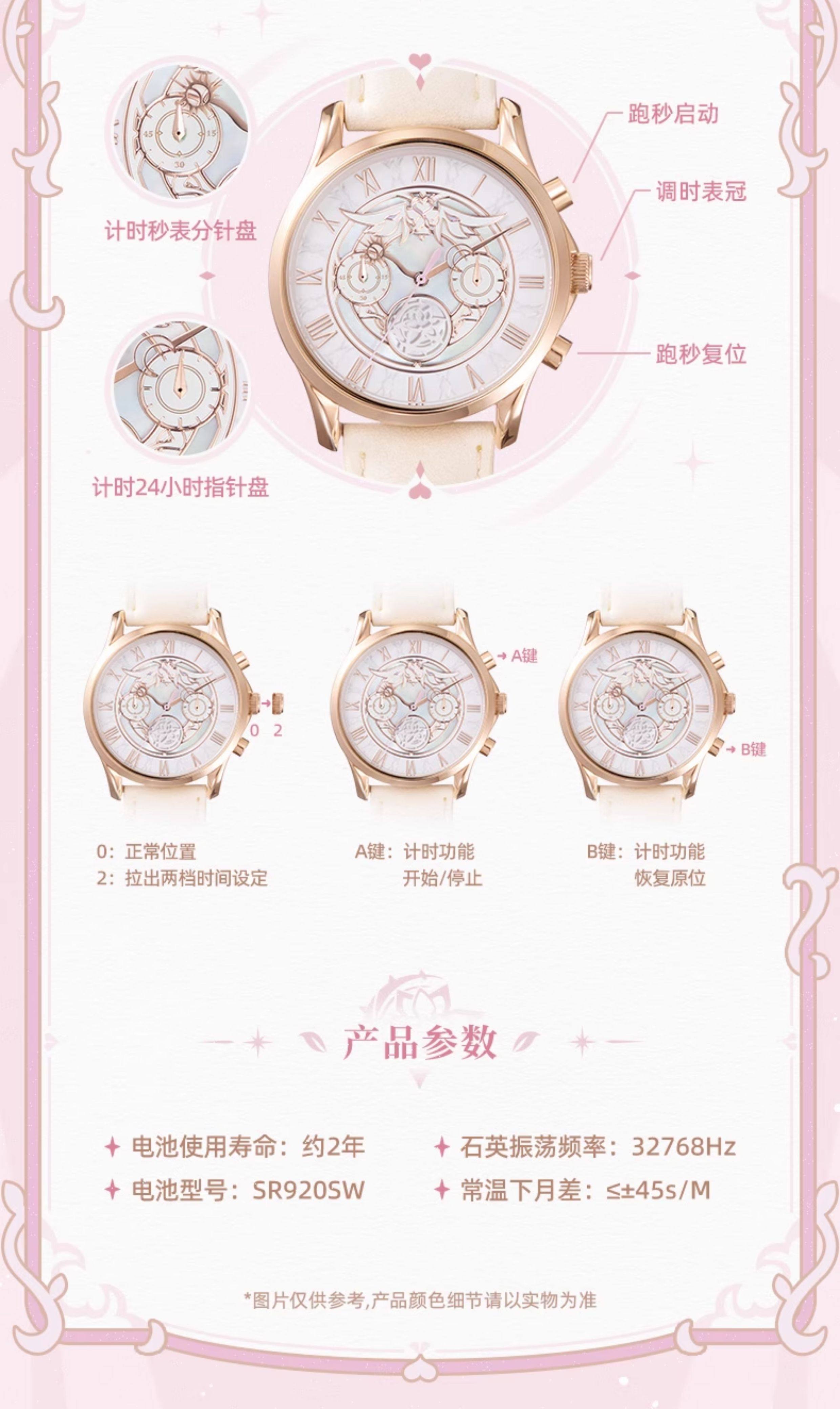 Note: The small pink hand shown in visuals is decorative and does not function as a second hand. The stopwatch second hand activates only when the chronograph is in use.