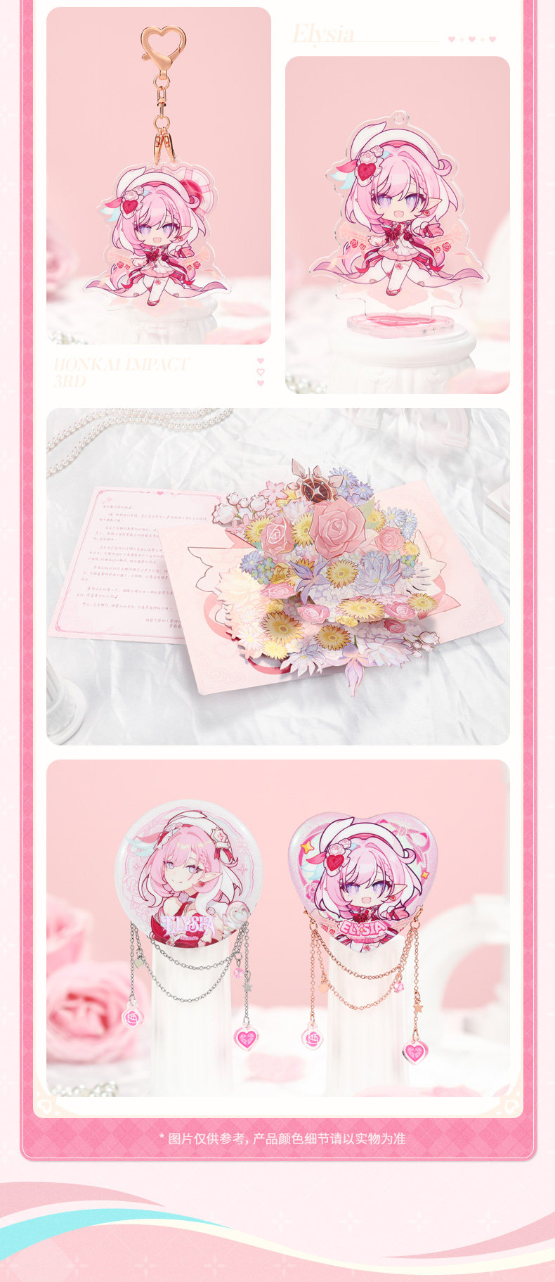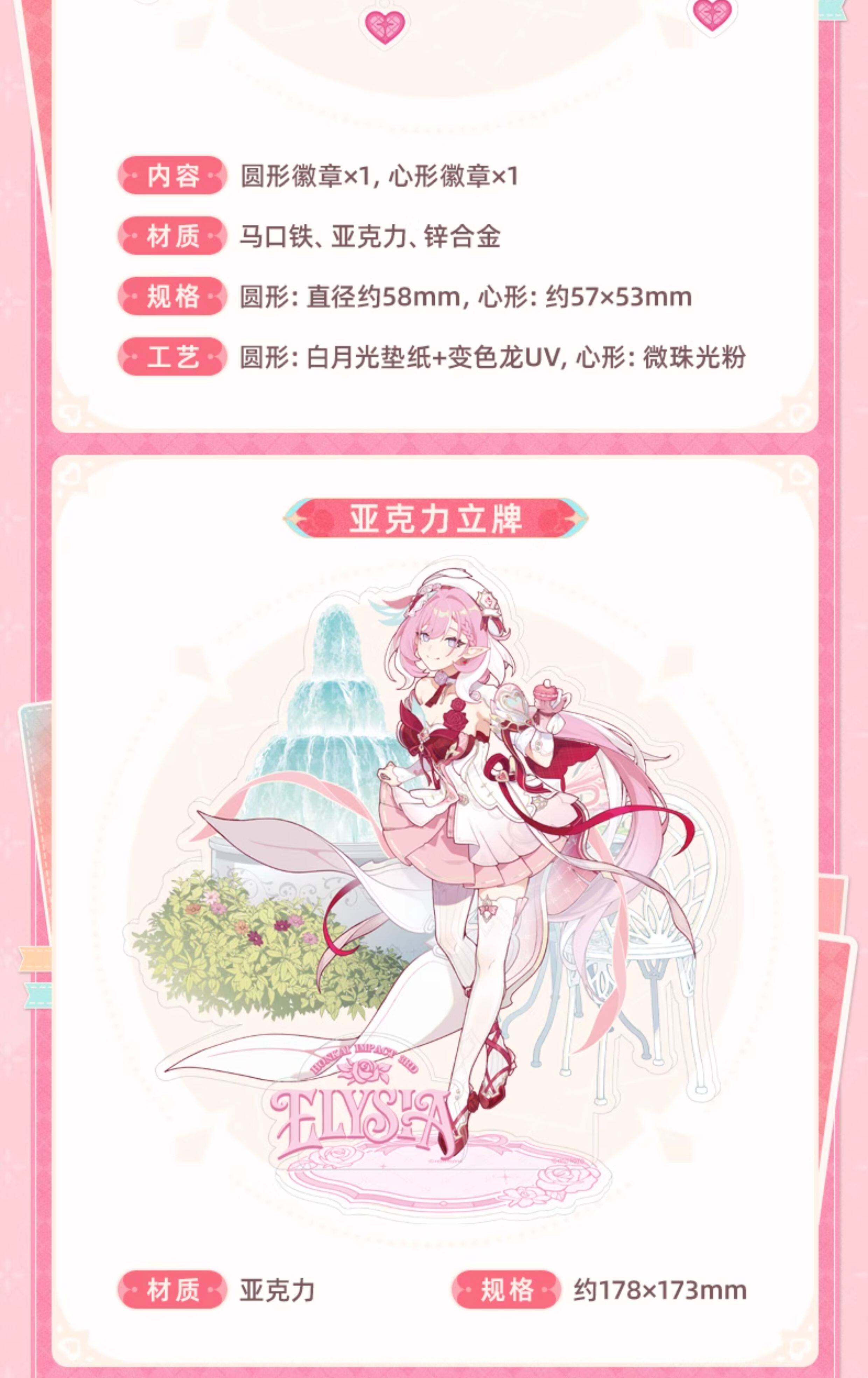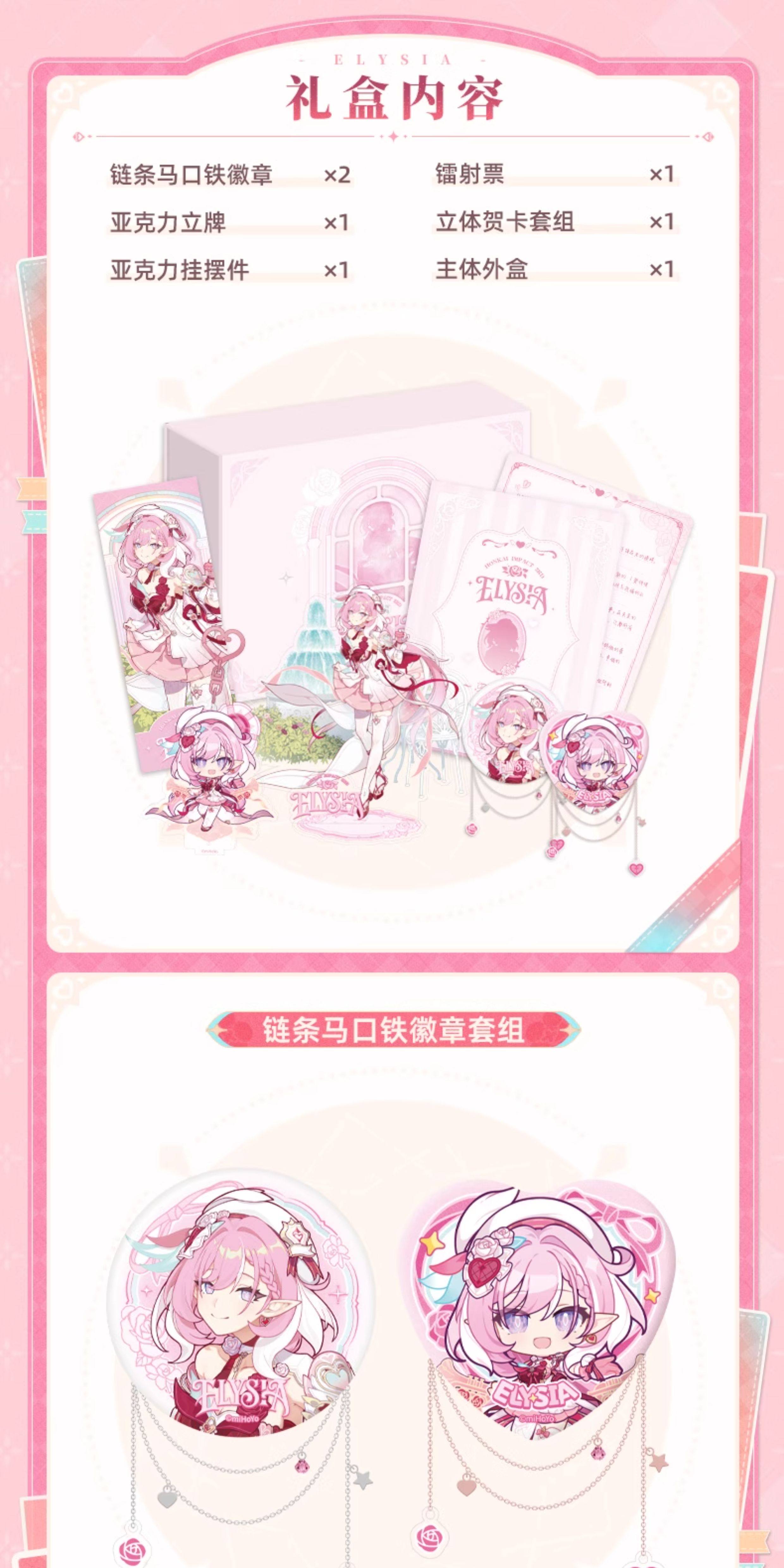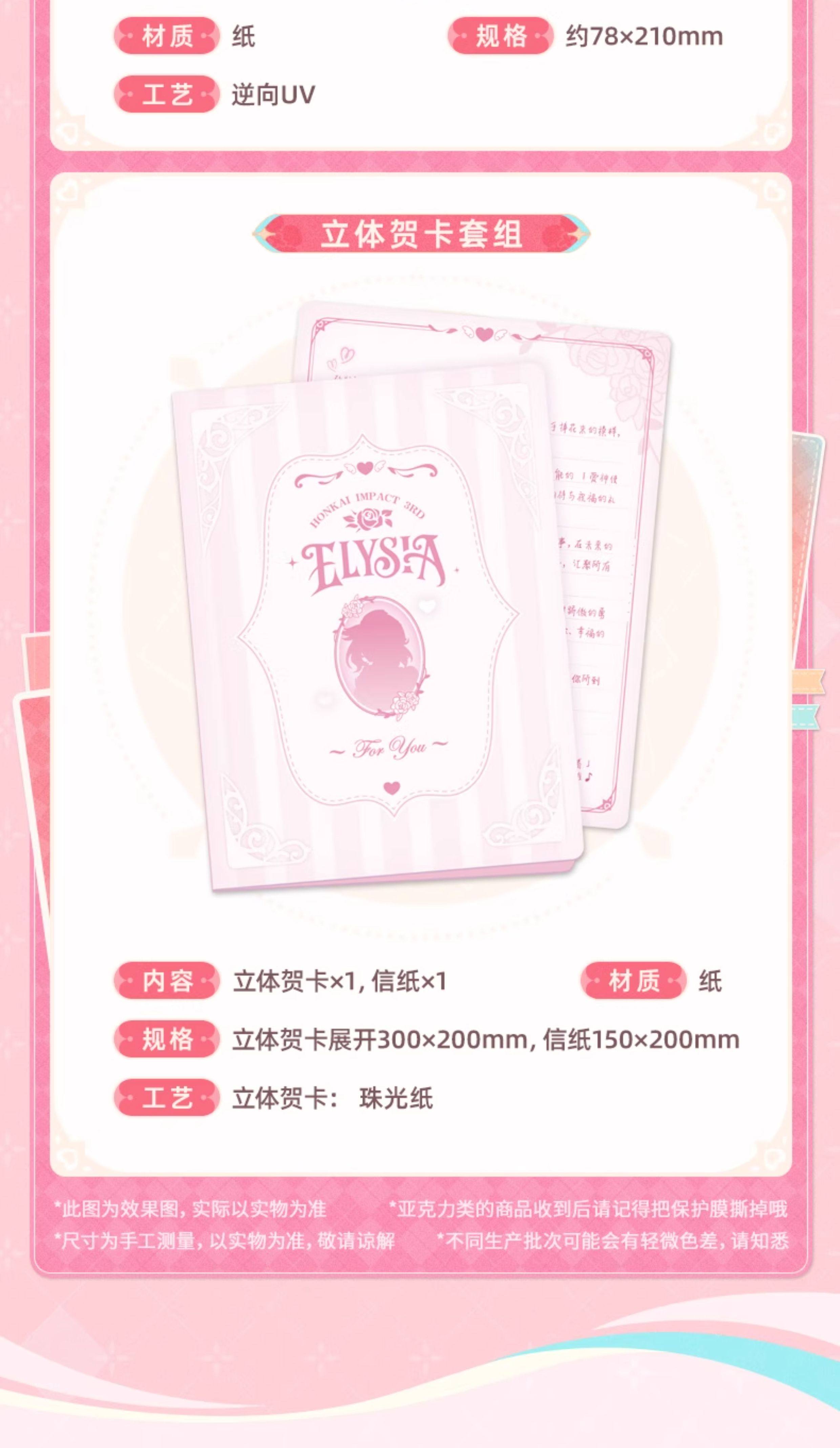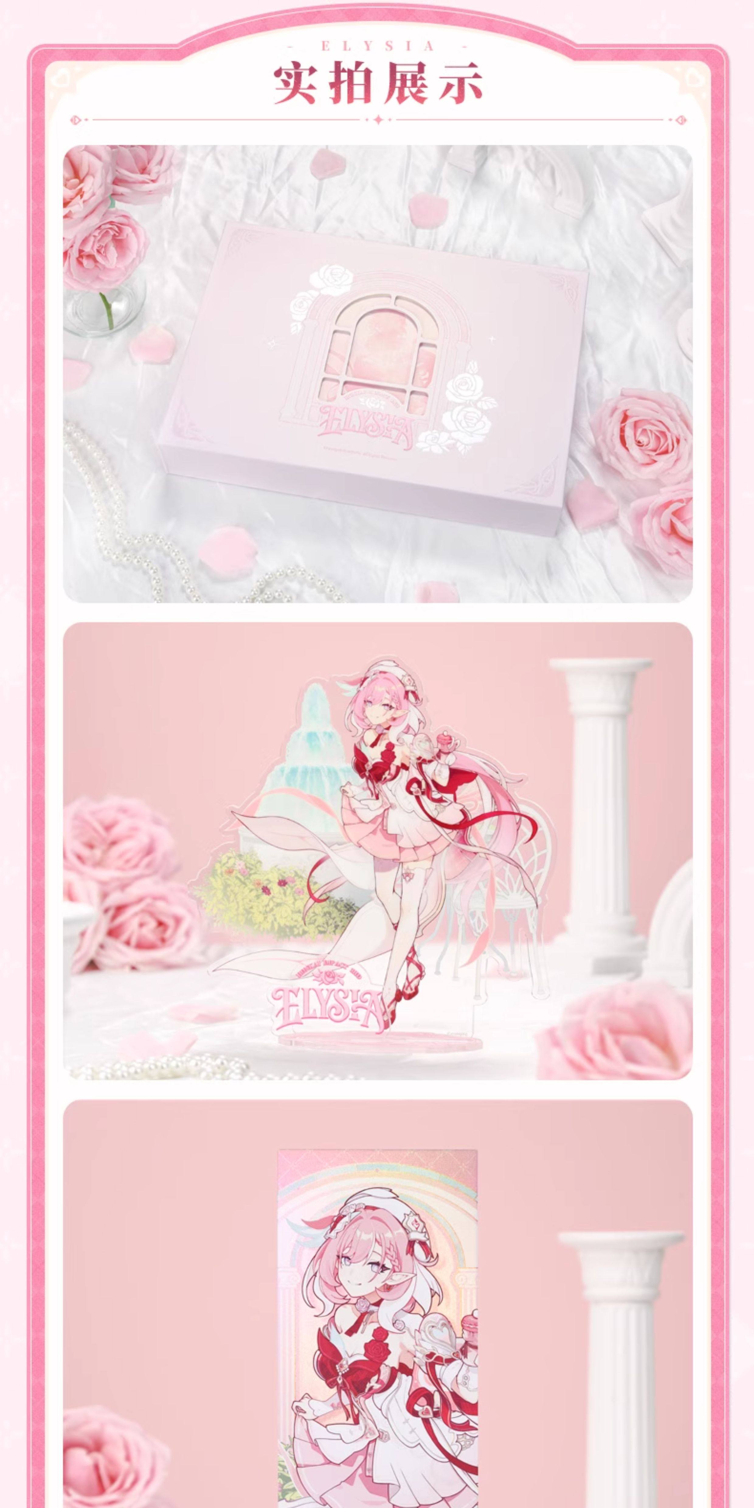 The set includes a variety of themed items, combining decorative and collectible pieces that capture Elysia’s gentle and cheerful personality. High-quality materials and refined printing techniques ensure a premium look and feel across all components.